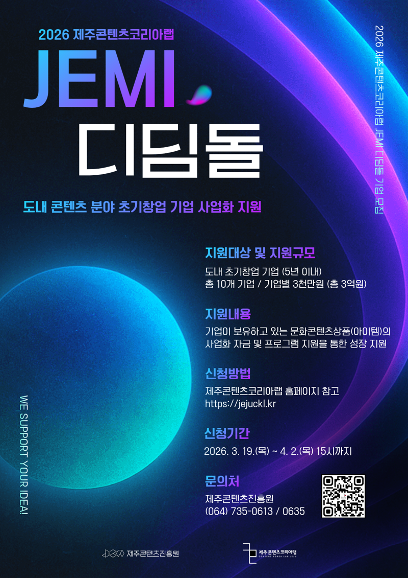 제주콘텐츠진흥원(원장 강민부)은 제주콘텐츠코리아랩 운영사업의 하나로 ‘2026 JEMI 디딤돌 지원사업’ 참여기업을 4월 2일까지 모집한다고 밝혔다.