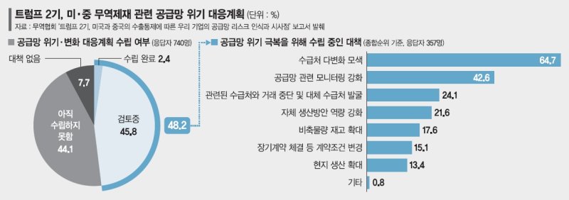 한국무역협회가 지난해 발간한 '트럼프 2기, 미국과 중국의 수출통제에 따른 우리 기업의 공급망 리스크 인식과 시사점' 보고서에 따르면 국내 기업들을 대상으로 '미중 무역제재 관련 공급망 위기 대응 계획'을 조사한 결과 '수립 완료'는 2.4%에 그쳤다. 45.8%는 '검토 중'으로 답한 가운데, 44.1%는 '미수립', 7.7%는 '대책 없음'으로 절반 이상은 무방비 상태였다. 기업들의 대응도 수급처 다변화(64.7%)에 집중돼 있으며, 공급망 모니터링 강화(42.6%), 거래처 전환 및 대체 수급처 발굴(24.1%), 자체 생산 역량 강화(21.6%) 등이 뒤를 이었다.