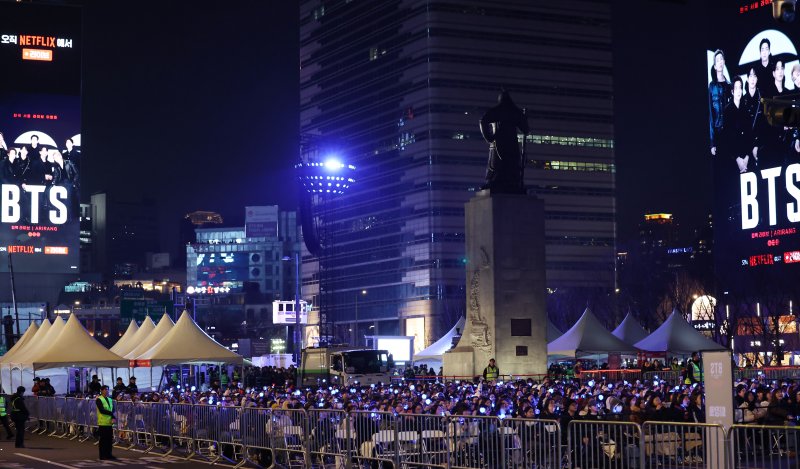 시장에서는 지난 21일 서울 광화문 광장에서 열린 BTS 컴백 공연이 하이브 주가 급락에 일부 영향을 미친 것으로 보고 있다.