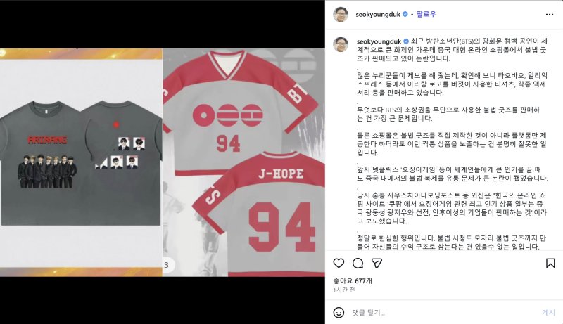 서 교수는 "불법 시청도 모자라 불법 굿즈까지 만들어 자신들의 수익 구조로 삼는다는 건 있을 수 없는 일"이라며 "이제는 그만해야 한다. 더이상 다른 나라의 콘텐츠를 도둑질하는 행위는 반드시 멈춰야만 할 것"이라고 일갈했다.