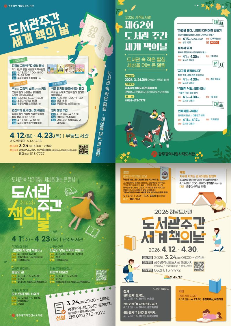 【파이낸셜뉴스 광주=황태종 기자】광주광역시 시립도서관(무등·사직·산수·하남)은 '도서관 주간(4월 12∼18일)'과 '세계 책의 날(4월 23일)'을 맞아 다양한 독서문화 행사를 추진키로 하고 24일부터 참가 신청을 받는다고 밝혔다.