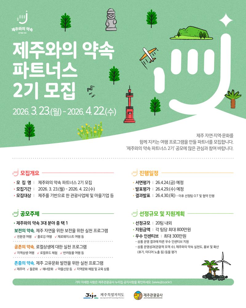 제주특별자치도와 제주관광공사는 4월 22일까지 온라인 채널을 통해 ‘제주와의 약속 파트너스 2기’ 공모를 진행하고 있다고 24일 밝혔다. 공모 대상은 제주를 기반으로 한 관광사업체와 마을기업 등이다. 신청은 제주관광공사 홈페이지 공지사항을 통해 가능하다.