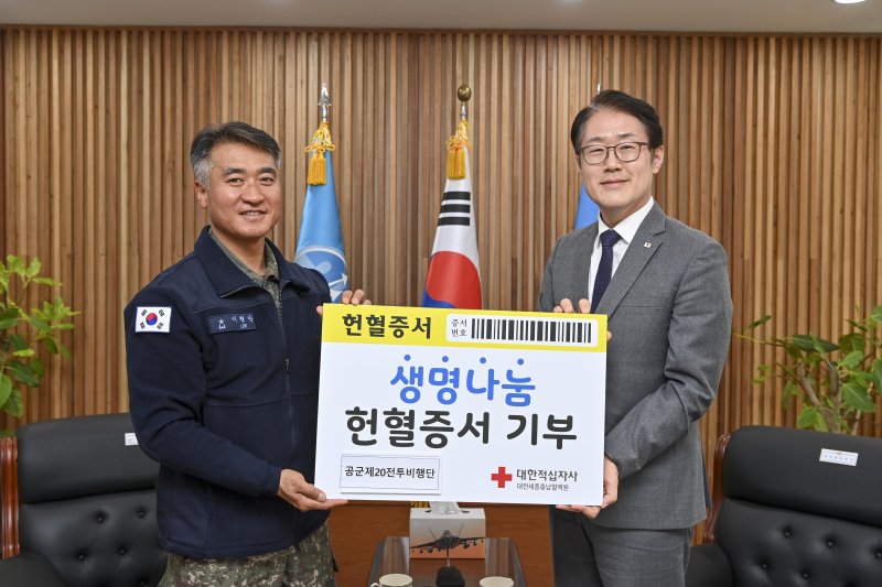 공군 제20전투비행단은 지난 23일 장병들이 모은 헌혈증 4000장을 대한적십자사 대전세종충남혈액원에 전달했다고 밝혔다.