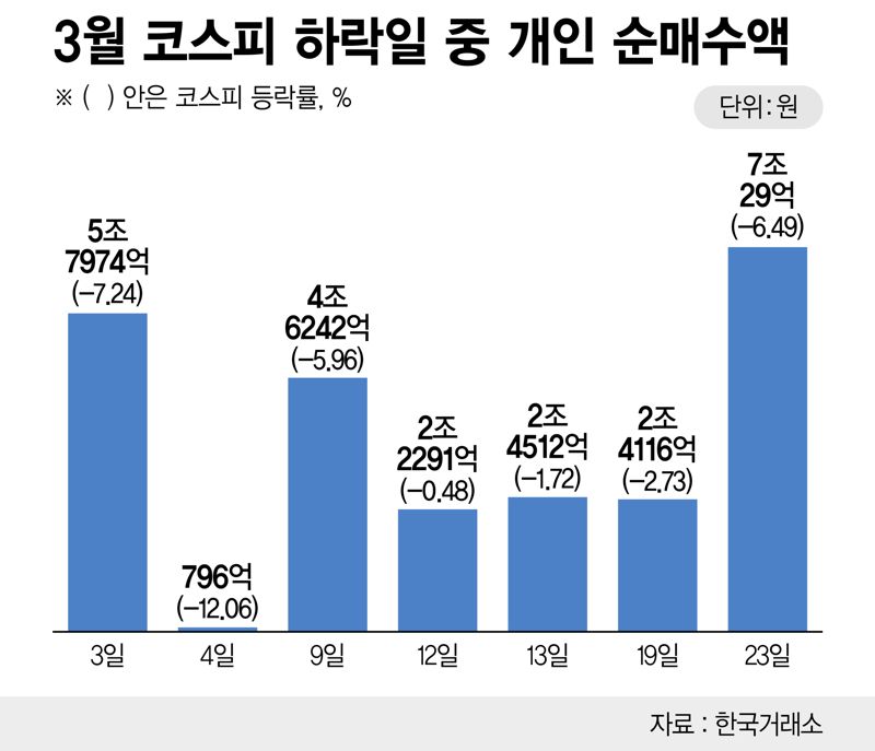 중동발 리스크로 코스피가 7.24% 하락한 지난 3일 개인은 5조7974억원을 순매수하며 자금 투입에 적극적이었다. 다음 날 코스피가 역대 최대 낙폭(12.06%)을 기록하면서 주춤하는 듯했지만, 당시에도 796억원 매수 우위를 보였다. 아울러 지난 23일에는 코스피 6.49% 급락에도 사상 최대 규모인 7조29억원을 순매수했다.