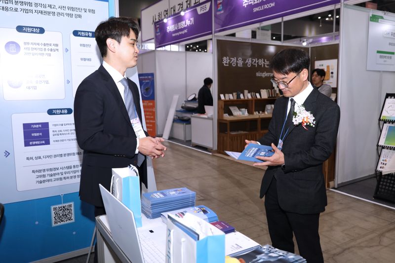 정연우 지식재산처 차장이 25일 오전 10시 경기도 고양 킨텍스 제1전시장에서 열린 '코리아 나라장터 엑스포 2026' 행사장에 마련된 지식재산 분쟁대응 지원 상담부스를 찾아 현장 관계자로 부터 지원 내용 등에 대한 설명을 듣고 있다.조달청이 주최한 이번 '코리아 나라장터 엑스포 2026'에서는 지식재산처-조달청 협력 확대 방안의 하나로 지식재산 분쟁대응 지원 상담부스를 운영한다.상담부스에서는 수출 예정인 조달기업의 지식재산 애로사항 청취 및 지원사업 안내가 진행됐다.