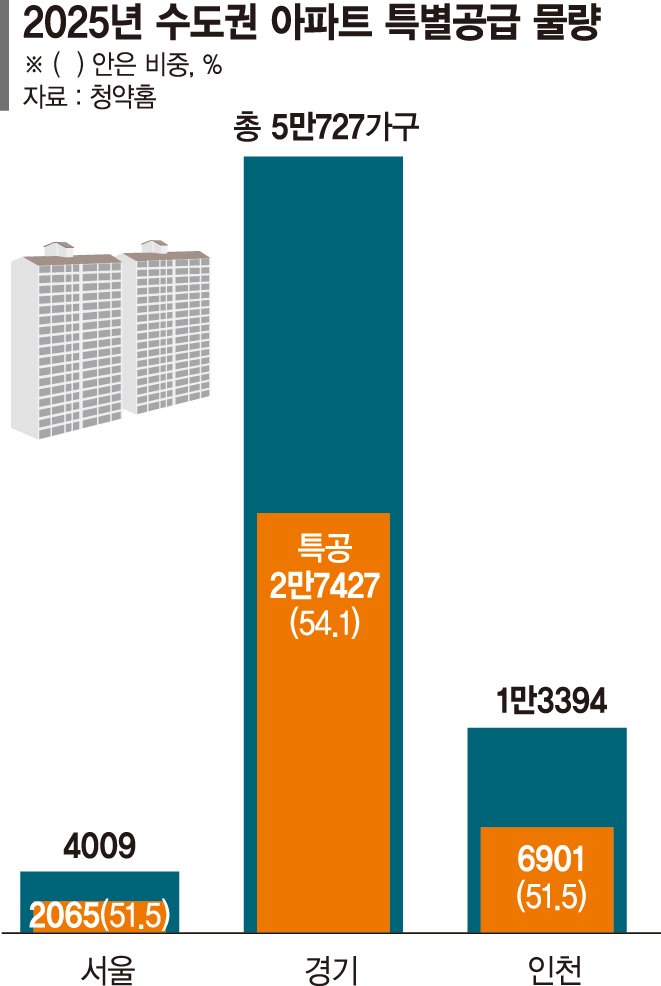 수도권 아파트 특공 물량이 일반을 추월한 것은 이번이 처음이다. 지난 2024년의 경우 수도권 아파트 공급 물량 가운데 특공 비중은 46.8%를 기록했다. 절반을 넘지 않은 것이다. 지역별로 봐도 서울, 경기, 인천 모두 40%대 수준을 보였다.