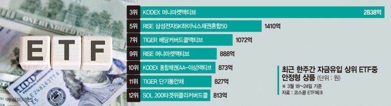 25일 코스콤 ETF체크에 따르면 최근 일주일간(18~24일) 자금유입 상위 ETF 10개 종목 중 절반은 안정형 ETF가 차지했다. 한 주간 파킹형 상품인 'KODEX 머니마켓액티브'에 2838억원의 자금이 순유입됐다. 전체 ETF 중 세 번째로 큰 규모다.