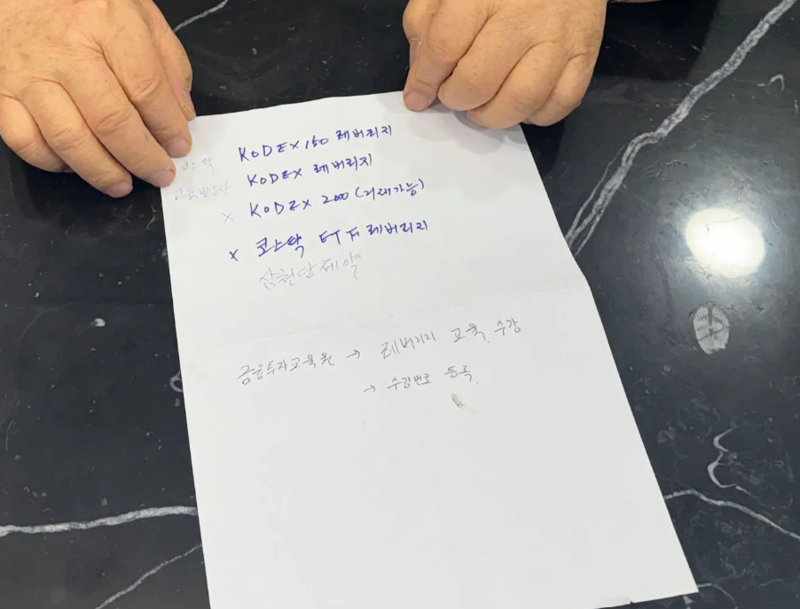 지난 2월 온라인 커뮤니티엔 ‘아… 금요일 객장 할머니…’라는 제목의 글과 함께 사진이 올라왔다. 객장은 증권사 영업소 내 투자고객이 모이는 장소로 사진엔 손글씨로 KODEX 코스닥150 레버리지, KODEX 레버리지, KODEX 200와 삼천당제약 등 종목을 적은 종이를 창구에 내밀고 있다.