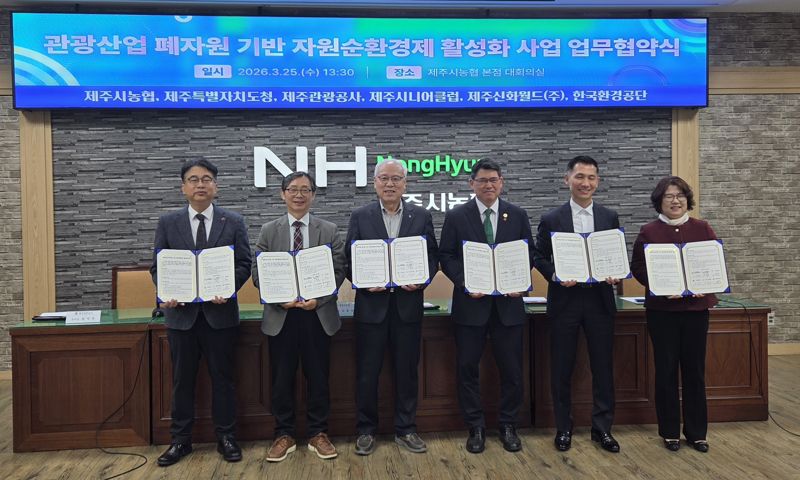 제주도는 25일 제주시농협에서 한국환경공단과 제주관광공사, 제주시농협, 제주시니어클럽, 제주신화월드와 ‘관광산업 폐자원 기반 자원순환경제 활성화’를 위한 업무협약을 체결했다고 밝혔다.