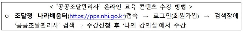 이번 온라인 교육 콘텐츠는 지난 1월에 공개한 ‘공공조달관리사’ 표준교재를 기반으로 제작됐다. 수험생은 교재와 온라인 강의를 병행하며 보다 효율적인 시험준비가 가능할 것으로 기대된다.