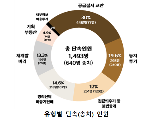 유형별 단속 인원은 공급 질서 교란이 448명으로 가장 많았고, 농지 투기 293명, 집값 띄우기 등 불법 중개 254명, 명의신탁·미등기 전매 218명, 재개발 비리 199명 등이 그 뒤를 이었다. 송치 인원으로는 농지 투기가 249명으로 가장 많았고, 불법 중개 120명, 명의신탁·미등기 전매 107명, 공급 질서 교란 77명 순으로 나타났다.
