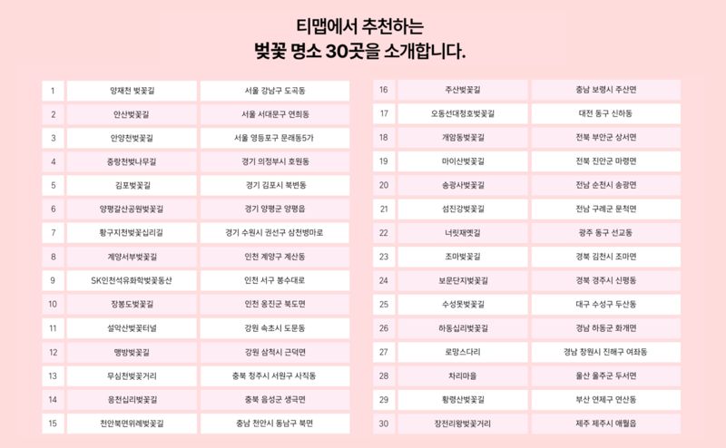 더 많은 벚꽃 명소를 찾고 싶으면 티맵의 장소 추천 서비스 '어디갈까' 발견 탭에서 '벚꽃나들' 테마에 들어가면 된다. 총 274개의 벚꽃길을 권역별로 나눠 정리해 벚꽃 명소를 한눈에 확인하고 여행 계획을 세울 수 있도록 했다.