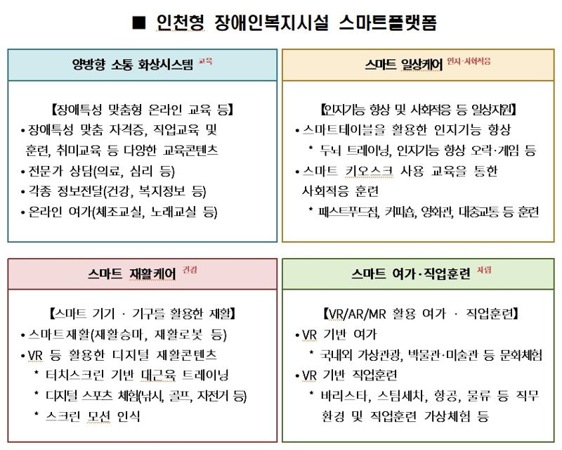 시는 플랫폼에 △전문가 상담과 교육이 가능한 ‘양방향 화상 소통 시스템’ △인지능력과 디지털 활용 능력 향상을 지원하는 ‘스마트 일상케어’(스마트테이블, 장애인용 키오스크 등) △재활운동과 기능 향상을 돕는 ‘스마트 재활케어’ △가상현실(VR) 기반 ‘스마트 여가·직업체험’ 등 4개 분야의 서비스를 구축한다.