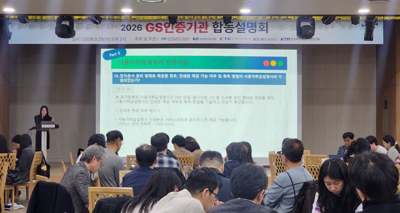 이번 설명회는 GS인증 획득을 희망하는 기업을 대상으로 인증기관별 인증 분야 확대를 통한 수요 분산과 재인증 점검표 안내 등 제도 개선 사항을 공유하고, 기업들이 인증 준비 과정에서 겪는 애로사항을 해소할 수 있도록 실무 중심의 정보를 제공하는데 초점을 맞췄다.