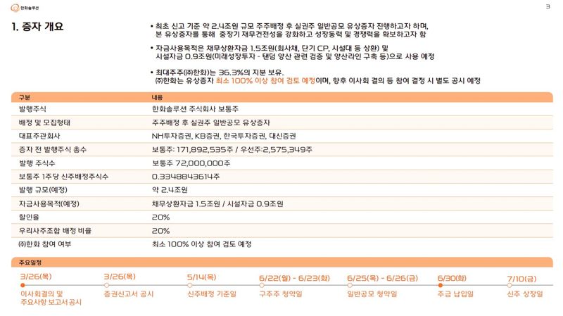 한화솔루션은 26일 이사회를 열고 보통주 7200만주를 신규 발행하는 유상증자를 결정했다고 공시했다. 증자 방식은 주주배정 후 실권주 일반공모다. 조달 규모는 총 2조3976억원이다. 신주 배정 기준일은 5월 14일이며, 발행가액은 6월 17일 확정된다.