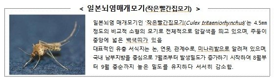 질병관리청은 일본뇌염 매개모기인 작은빨간집모기가 제주에서 올해 처음 확인됨에 따라 지난 20일 전국 일본뇌염 주의보를 발령했다. 올해는 작년보다 감시 시작 시점이 1주 앞당겨졌다. 감시 이틀 만에 채집된 모기 가운데 작은빨간집모기 1개체가 확인됐다.