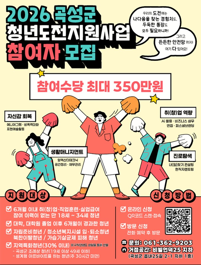 신청 대상은 신청일 기준 6개월 이상 취업 및 직업훈련 이력이 없는 만 18세 이상 34세 이하 구직단념청년(문답표 21점 이상)이다. 또 자립준비청년, 청소년복지시설 입·퇴소 청년, 북한이탈청년 등도 참여할 수 있다. 군은 지역특화청년 제도를 통해 일부 대상에 한해 만 49세까지 지원한다.