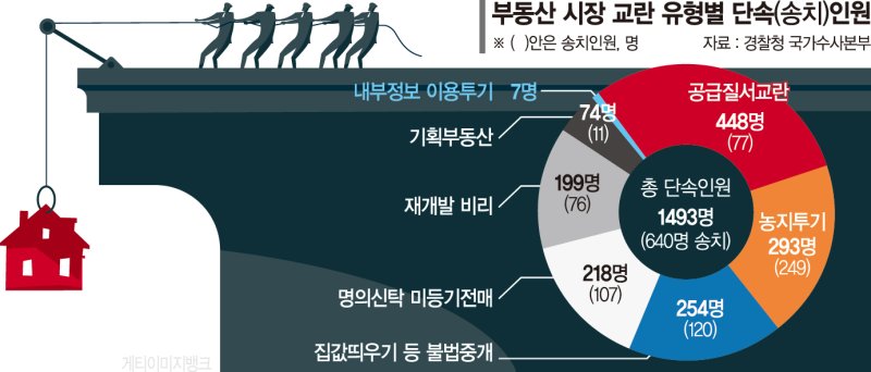 유형별 단속 인원은 공급 질서 교란이 448명으로 가장 많았고, 농지 투기 293명, 집값 띄우기 등 불법 중개 254명, 명의신탁·미등기 전매 218명, 재개발 비리 199명 등이 그 뒤를 이었다. 송치 인원으로는 농지 투기가 249명으로 가장 많았고, 불법 중개 120명, 명의신탁·미등기 전매 107명, 공급 질서 교란 77명 순으로 나타났다.