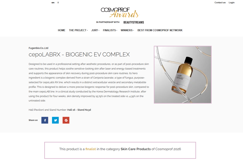 '세포랩RX 바이오제닉 EV 컴플렉스'는 아시아 지역 뷰티 브랜드 중 유일하게 스킨케어 부문 최종 후보에 올랐다. 이 시상식은 뷰티업계에서 권위를 인정받는 상 중 하나다. 40개 최종후보 가운데 7개의 국내 뷰티제품 중 하나로 이름을 올렸다.
