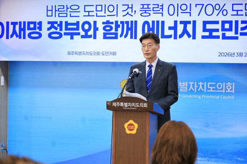 문 의원은 이날 제주특별자치도의회 도민카페에서 기자회견을 열고 제주 바람과 햇빛을 도민의 공공 자산으로 관리하겠다고 밝혔다. 이재명 정부의 에너지 전환 기조를 제주에서 먼저 실현해 ‘제주 생애주기 기본사회’ 재원으로 연결하겠다는 구상도 함께 내놨다.