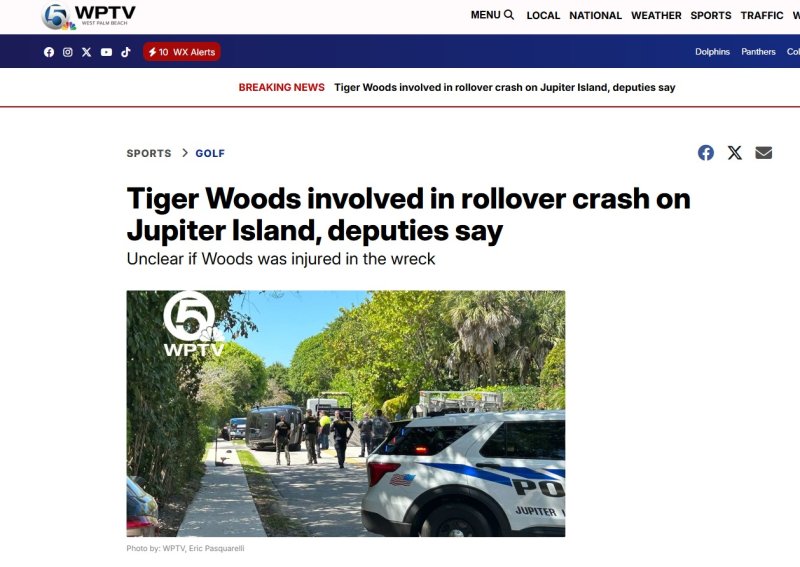 미국 플로리다주 웨스트팜비치 지역 방송국인 WPTV는 이날 오후 2시께 우즈가 주피터섬 도로에서 전복 사고를 당했다고 사진과 함께 보도했다.