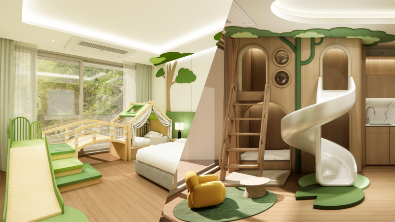 S30 타입(사진 오른쪽)은 대형 트리하우스와 나선형 슬라이드, 비밀 침대 공간 등을 갖춘 놀이 중심 구조로 구성됐으며, S20 타입은 침실과 플레이존이 결합된 스튜디오형으로 원목 미끄럼틀과 텐트 하우스를 배치했다.