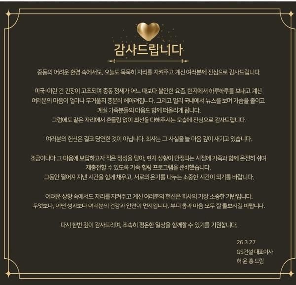 지난 27일 허 대표는 중동 현장에서 근무하는 임직원들에게 "여러분의 헌신은 당연한 것이 아니다"라며 "어떠한 경우에도 임직원의 안전을 최우선 가치로 삼고, 필요한 모든 조치를 적극 시행하겠습니다"고 했다.