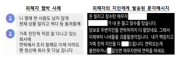 연체가 발생하면 추심업자가 대포폰이나 추적이 어려운 텔레그렘을 이용해 협박하고, 피해자 가족과 지인에게까지 협박과 욕설이 담긴 문자메시지를 무차별적으로 전송하는 등 불법 추심을 일삼았다.