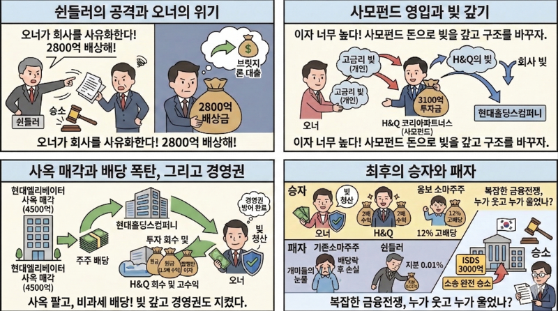 쉰들러는 오너가 회사를 사유화한다며 현대엘리베이터를 공격했고, 주주대표 소송을 진행해 승소했다. 2800억원의 배상 책임을 지게된 오너는 빚을 내어 회사에 그 돈을 갚았다. 하지만 이자 부담이 컸던 오너는 사모 펀드(H&Q)에게 투자금을 받아 다시 그 빚을 갚았다. 그 과정에서 오너는 지주회사의 배당 정책(비과세)을 활용해 사모 펀드에 빚을 갚고 지배력도 방어했다. 배당을 위해 부족한 자금은 현대엘리베이터 사옥을 매각해 충당했다.
