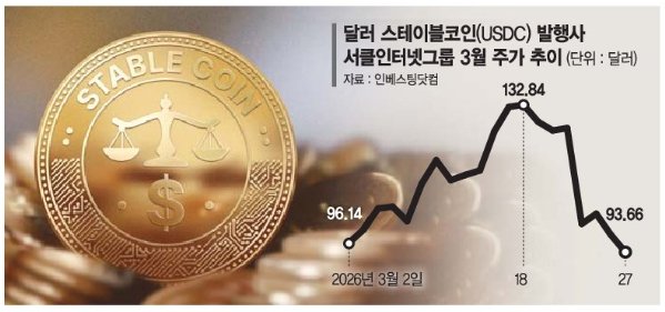 시장은 즉각 반응했다. 인베스팅닷컴에 따르면 서클(CRCL) 주가는 합의 소식이 전해진 지난 24일(현지시간) 20% 급락하며 101.17달러까지 밀려났다. 이후에도 약세가 이어져 27일 종가 기준 93.66달러를 기록, 단기 고점 대비 30% 안팎 하락한 상태다. 코인베이스(COIN) 등 관련주 역시 동반 약세를 면치 못했다.