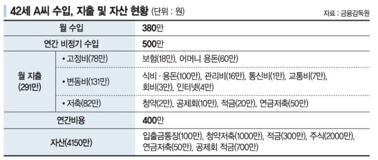 42세 A씨 월 수입은 380만원이다. 연간 비정기 수입은 500만원이다. 월 지출은 291만원이다. 고정비는 보험(18만원), 어머니 용돈(60만원) 등 78만원이다. 변동비는 식비·용돈(100만원), 관리비(16만원), 통신비(1만원), 교통비(7만원), 회비(3만원), 인터넷(4만원) 등 131만원이다. 저축은 청약(2만원), 공제회(10만원), 적금(20만원), 연금저축(50만원) 등 82만원이다. 연간 비용은 400만원이다. 자산은 입출금통장(100만원), 청약저축(1000만원), 적금(300만원), 주식(2000만원), 연금저축(50만원), 공제회적금(700만원) 등 총 4150만원이 있다.
