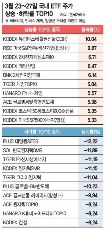 게임 관련 ETF도 강세를 보였다. 'KODEX 게임산업'(6.47%), 'TIGER 게임TOP10'(5.84%)가 나란히 상위권에 이름을 올렸다. 펄어비스의 신작 '붉은사막'이 예상 밖 선전을 하면서 게임주에 대한 전망이 긍정적으로 바뀐 덕분이다.