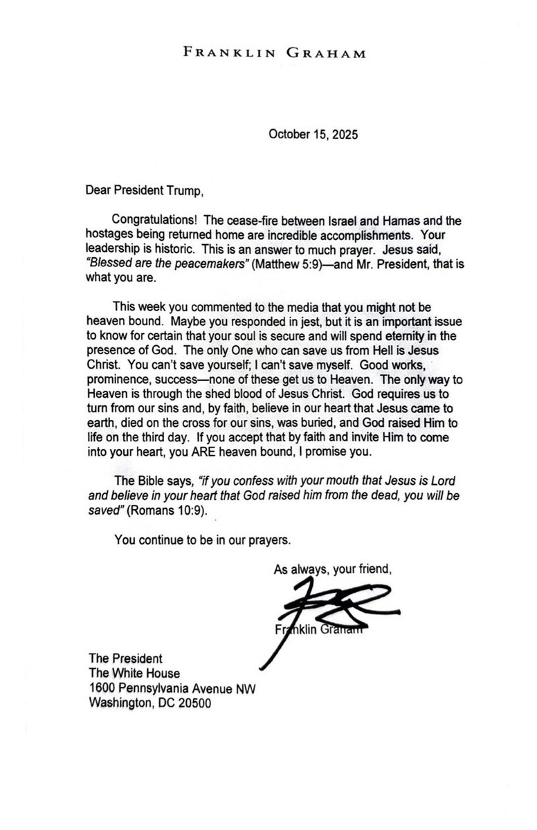 그레이엄 목사는 편지에서 “이스라엘과 하마스의 휴전과 인질 귀환은 놀라운 성과”라며 “당신의 리더십은 역사적”이라고 평가했다. 이어 신약성서 마태복음 구절을 인용해 “화평케 하는 자는 복이 있다”며 “그게 바로 당신”이라고 강조했다.