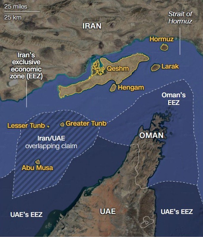 중국 주하이의 쑨원대학 연구원들이 이란의 ‘핵심 방어선’으로 분류한 호르무즈 해협의 7개섬은 아부 무사, 그레이터(大) 툰브, 레서(小) 툰브, 헹감, 케슘, 라라크, 호르무즈다.