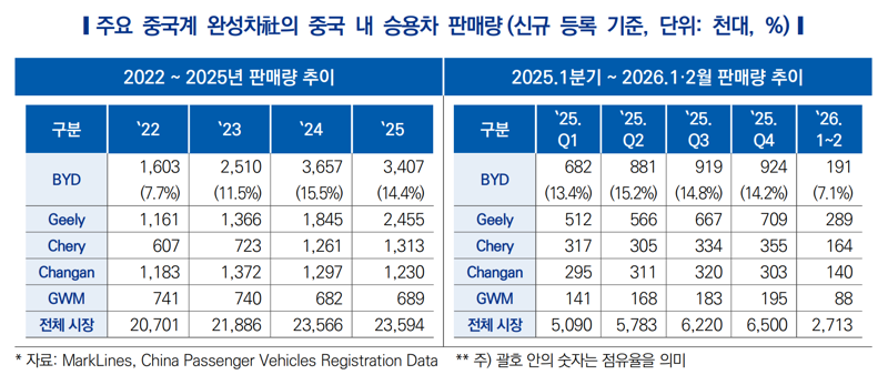 이호 한국자동차연구원 책임연구원은 "BYD의 2024년 말~2025년의 정체는 업체 간 출혈 경쟁인 이른바 '내권(內卷)' 심화가 주된 원인"이라며 "올 1~2월의 갑작스러운 급락은 중국 정부가 자동차 산업의 질적 성장을 위해 도입한 제도 변화의 영향으로 소형·저가차 중심의 약세가 유발된 결과"라고 진단했다.