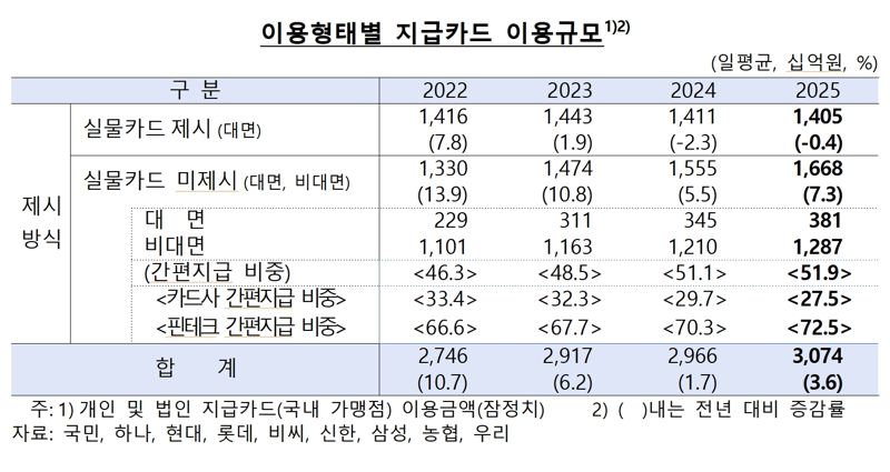 실물카드를 직접 제시하는 결제는 1조4000억원으로 0.4% 감소했다. 온라인 쇼핑과 모바일 서비스 이용이 늘면서 카드 없이 결제하는 방식이 빠르게 확산되는 모습이다.