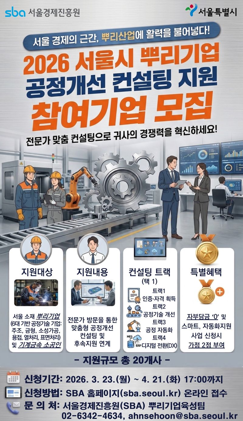안세훈 서울경제진흥원 뿌리기업육성팀 책임은 "과거의 실적보다는 개선의 시급성과 경영진의 혁신 의지를 피력해 실제 변화를 만들어 낼 준비가 된 기업을 우선 선정할 것"이라며 "고용, 매출 등에서 정체기에 있는 기업들이 문제를 해결할 수 있도록 기획했으며 체질개선, 기술지원 등 성장을 위한 변화가 필요한 기업들의 많은 관심과 참여를 바란다"고 말했다.