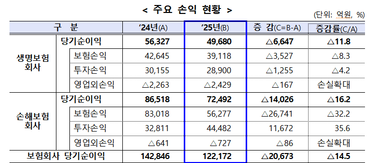 금융감독원이 30일 발표한 '2025년 보험회사 경영실적'에 따르면 생명보험사 22개·손해보험사 30개의 당기순이익은 12조2172억원으로 집계됐다. 전년보다 약 2조673억원(14.5%) 줄어든 수치다.