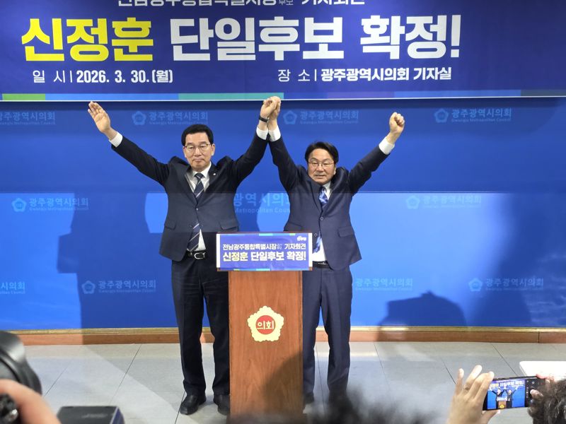또 "강기정과 신정훈, 이제 두 이름은 하나의 심장으로 뛴다"면서 "이번 단일화는 지지율을 합치는 계산이 아니라 시대의 눈물과 열망이 만난 희망의 서약"이라고 덧붙였다.