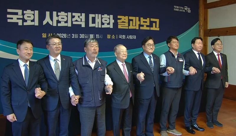 지난해 국회 주도 사회적 대화체를 출범시킨 우원식 국회의장은 30일 국회 사랑재에서 결과 보고회를 열고 “비상계엄과 탄핵, 조기대선이라는 정치적 격변에도 사회적 대화를 이어왔다”며 “AI 시대 지속가능한 경쟁력 확보와 특고(특수형태근로종사자), 플랫폼 노동자, 프리랜서에 대한 사회적 보호에 필요한 과제를 공동으로 정립하는 단계에 이르렀다”고 밝혔다.