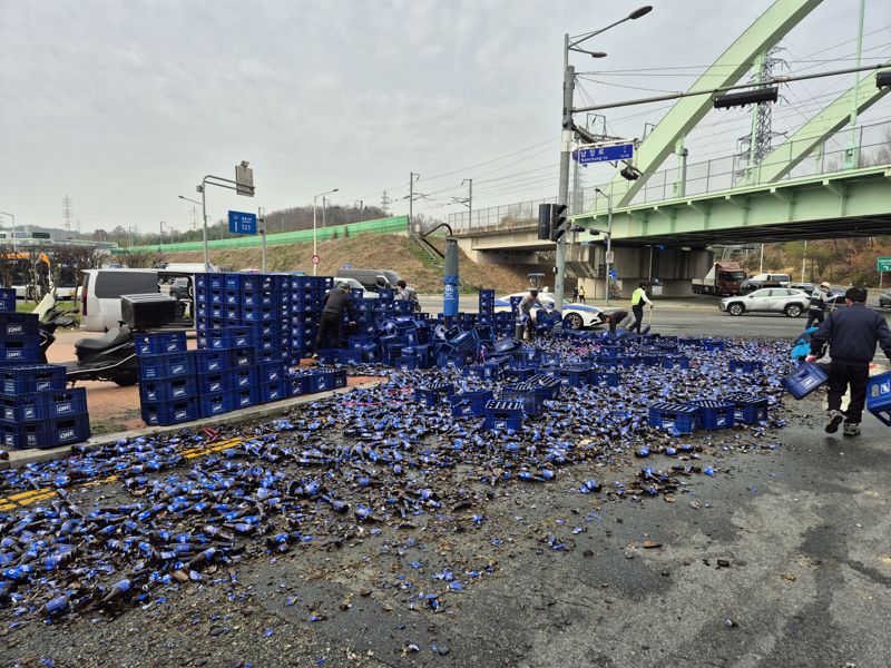 30일 울산경찰청에 따르면 이날 오전 9시 25분께 울산 남구 두왕사거리 인근 도로에서 25t 윙바디 트럭에 실려 있던 카스 맥주병 수천 개가 도로에 떨어졌다.