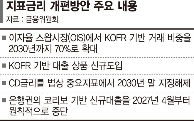 금융당국이 양도성예금증서(CD) 금리를 오는 2030년 금융거래지표법상 중요지표에서 지정 해제한다. 또 한국형 무위험지표금리(KOFR) 사용을 확대하기 위해 KOFR의 거래 비중을 확대하고, KOFR 기반 대출상품을 신규 도입하기로 했다.