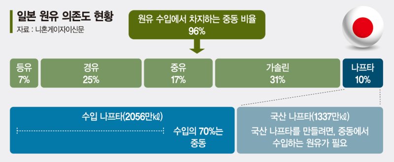 일본은 원유 수입의 약 96%를 중동에 의존하고 있으며 이 가운데 대부분이 호르무즈 해협을 통과한다. 과거 러시아·우크라이나 전쟁 당시 러시아산 원유 비중이 4% 수준에 불과했던 것과 비교하면 이번 위기는 일본 에너지 공급망에 훨씬 직접적이고 치명적인 충격을 주고 있다.