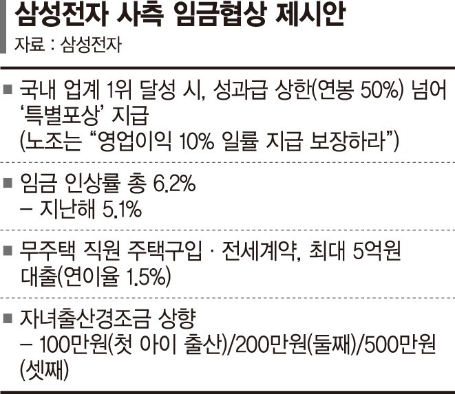 이에 따르면 삼성전자 사측은 올해는 물론 향후에도 매출·영업이익이 국내 업계 1위 달성 시 메모리사업부 직원들에게 경쟁사 대비 동등 수준의 지급률을 보장하겠다며, 기존 성과급상한선(연봉의 50% 규정)을 넘는 '특별포상안'을 노조 측에 제안했다고 밝혔다. 또한 올해 적자가 예상되는 시스템LSI 및 파운드리 사업부에 대해선 경영성과 개선 시 초과이익성과급(OPI) 50% 외에 추가로 25%를 얹어 최대 75%의 성과급을 지급하겠다고 제안했다. 성과급 재원으로 영업이익의 13%를 사용하는 것이자, 특별포상을 통해 "성과급 상한을 유지해야 한다"는 기존 사측 입장에서 한발 물러난 것이다. 영업이익 10%를 성과급으로 지급해야 한다는 노조 측 주장보다 진일보한 제안이다.