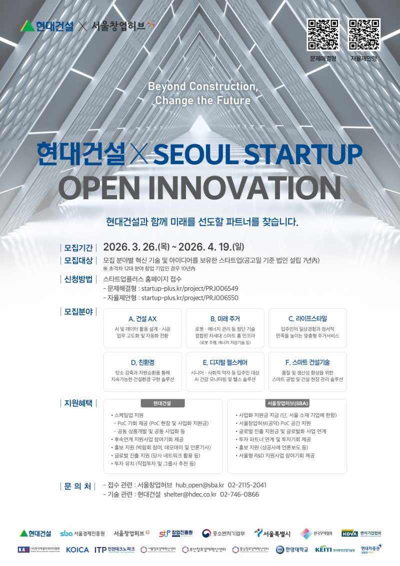 현대건설은 서울시 창업지원기관인 서울경제진흥원과 함께 '2026 현대건설×서울 스타트업 오픈 이노베이션(포스터)' 공모전을 개최한다고 30일 밝혔다.