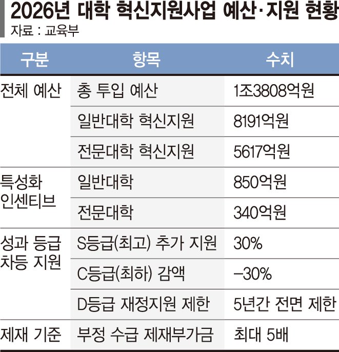 환류 체계도 한층 엄격해진다. 2027년부터는 기존 평가등급(S∼C)에 D등급을 신설한다. 혁신 노력이 현저히 낮은 대학에 D등급을 부여해 당해 사업비를 감액하고, 2년 연속 D등급을 기록할 경우 향후 5년간 재정지원을 전면 제한하는 강력한 조치를 예고했다.