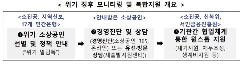 알림톡을 받은 소상공인은 온라인으로 사업체의 경쟁력과 생존 가능성, 성장 전망 등을 확인하고 소상공인시장진흥공단이 운영하는 전국 78개 새출발지원센터에서 원스톱 상담과 지원을 받을 수 있다.
