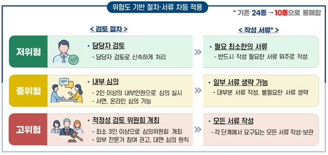 절차도 간소화됐다. 위험도에 따라 검토 방식과 서류를 차등 적용해 저위험 사안은 담당자 판단만으로 처리할 수 있도록 했으며, 작성 서식도 24종에서 10종으로 줄였다. 과도한 검토와 문서 부담으로 데이터 활용을 포기하던 관행을 완화했다는 평가다.