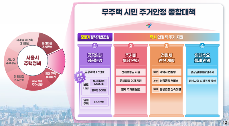 미리내집을 포함한 공공임대 거주자까지 대상을 확대해 최대 3억원을 최장 12년(금리 4.5%)까지 지원해 실질적인 주거비 부담을 낮춘다. 일시적 주거 불안정에 처한 무주택 임차인에게도 최대 3억원을 최대 3% 이자로 최장 2년간 한시 지원한다. 또 주택, 고시원 등에 살고 있는 취약계층을 위한 ‘서울형 주택바우처’ 지원도 확대한다.