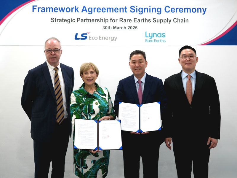 [파이낸셜뉴스] LS에코에너지는 지난 30일(현지시간) 글로벌 희토류 원료 공급 2위 기업인 호주 라이너스와 LS전선 싱가포르 지사에서 업무협약을 체결하고 희토류 원료 공급과 금속 양산 계획을 구체화했다고 31일 밝혔다.